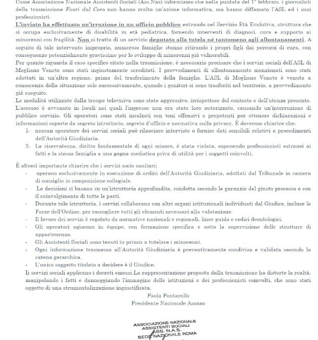 Come Associazione Nazionale Assistenti Sociali (Ass.Nas) informiamo che nella puntata del 1° febbraio, giornalisti della trasmissione Fuori dal Coro non hanno svolto un’azione informativa, ma hanno diffamato l’ASL ed i suoi professionisti.