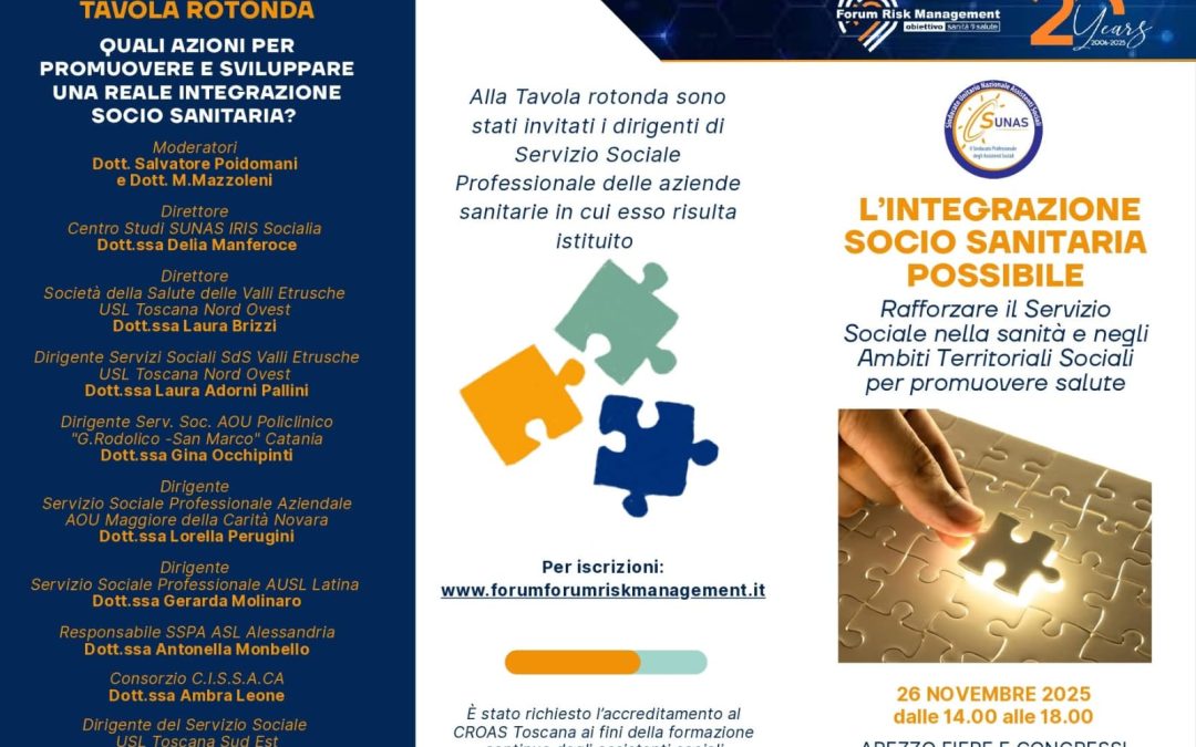 Si è svolto il 26 novembre 2025, presso Arezzo Fiere e Congressi, l’importante tavola rotonda dal titolo “L’Integrazione Socio Sanitaria Possibile – Rafforzare il Servizio Sociale nella sanità e negli Ambiti Territoriali Sociali per promuovere salute”, organizzata nell’ambito del Forum Risk Management.